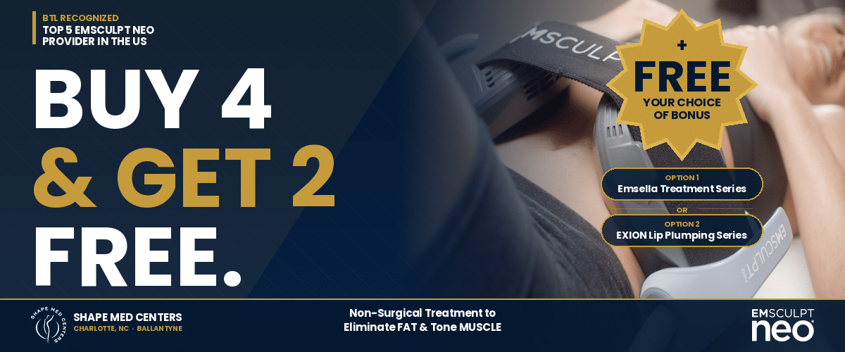 The easiest way to save and get our special BUY 4, GET 2 FREE is to contact your closest Shape Med Center directly and book your free consultation. Our number is 1-704-525-9772 or request a consultation by clicking the “Book a Free Consult” button on this page.